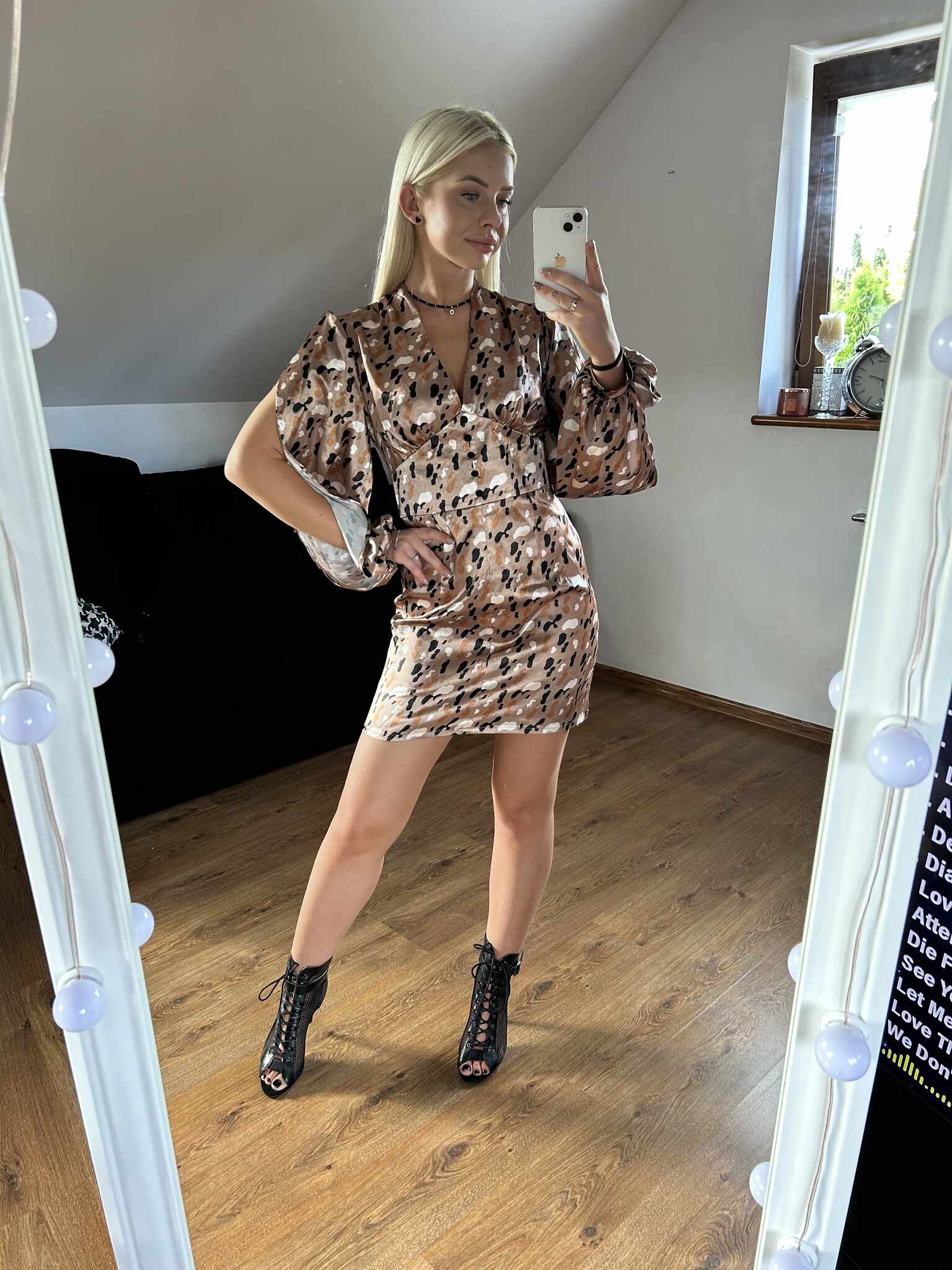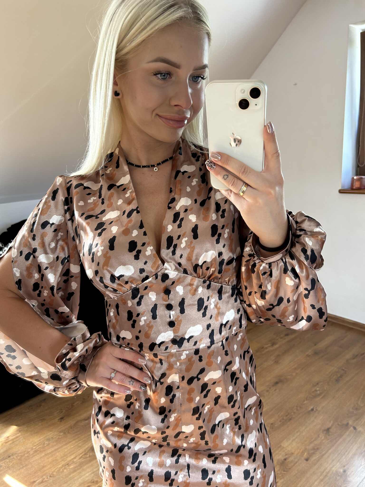 Sukienka Beatrice jest stylizacją idealną na większe wyjścia. Model dopasowany do sylwetki. Krótka spódniczka, przylegająca do ciała i dla kontrastu szeroki rękawy z ozdobnymi rozcięciami po całej długości zwieńczone delikatnym mankiecikiem. Dekolt uwydatniony poprzez marszczenia oraz głębokie wycięcie. Bezpośrednio pod biustem, Szeroki pasek podkreślający talię. Ozdobne guziczki od biustu do pasa dodają pazura stylizacji. Sukienka zapinana na plecach na kryty suwak. Tkanina to satynowa mieszanka wiskozy i poliestrem w najmodniejszym w tym sezonie princie.