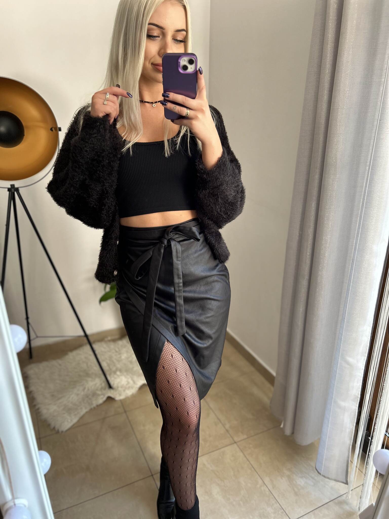 Spódniczka Etna to świetna alternatywa dla klasycznych spódnic. Wykonana z ekoskóry, delikatnie elastyczna dzięki czemu nie ogranicza naszych ruchów, a współgra z dynamiką ciała! Model stworzony w stylu „na kopertę”- przewiązując taśmy dookoła ciała sama decydujesz o tym jak mocno ja zasznurujesz. Długość najmodniejsza w tym sezonie! – oczywiście 3/4. Odsłaniasz ile chcesz, ale zasłaniasz to co potrzeba! Idealne połączenie stylu, elegancji i wygody.