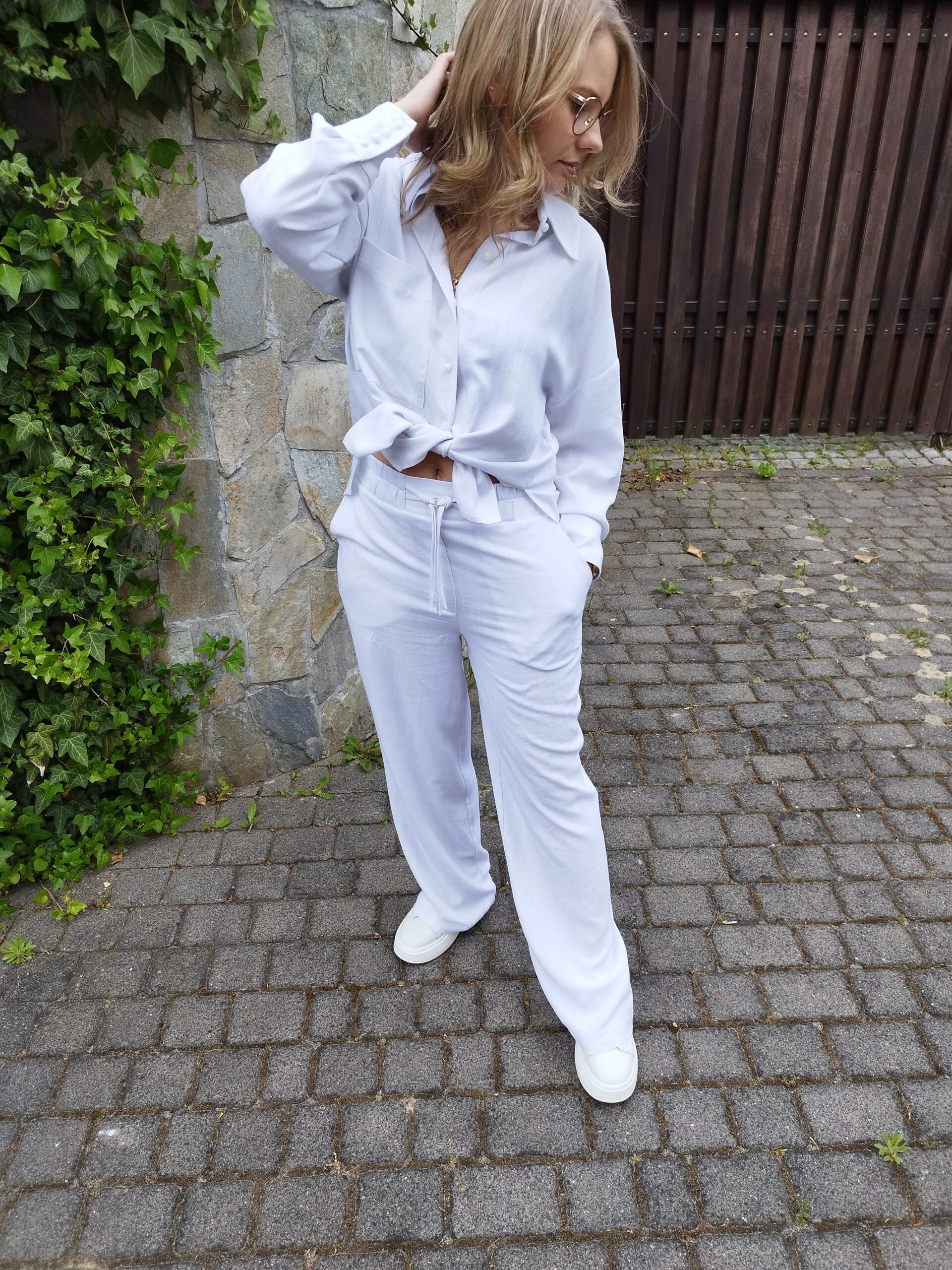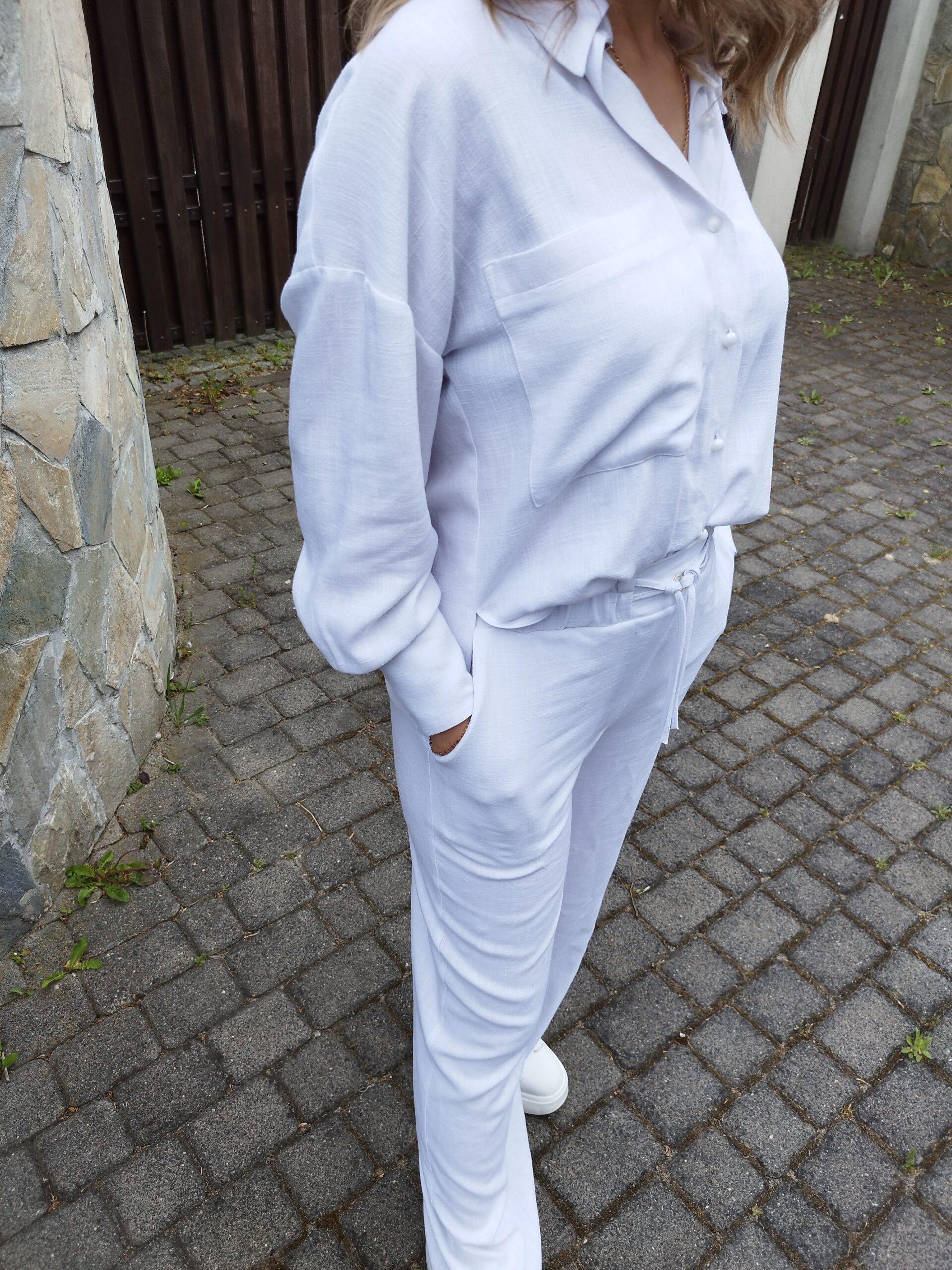 Komplet lniany Marry to stylizacja składająca się z dwóch elementów – spodni i koszuli. Klasyczna , luźna koszula z prostą plisa zapinaną na guziki. W komplecie spodnie z szeroką nogawką – hit tego sezonu!!! Komplet wykonany z lnu z domieszka wiskozy, dzięki czemu tkanina w dotyku jest miękka, aksamitna, a struktura delikatnie lejąca. Pozycja obowiązkowa w szafie każdej stylowej kobiety!