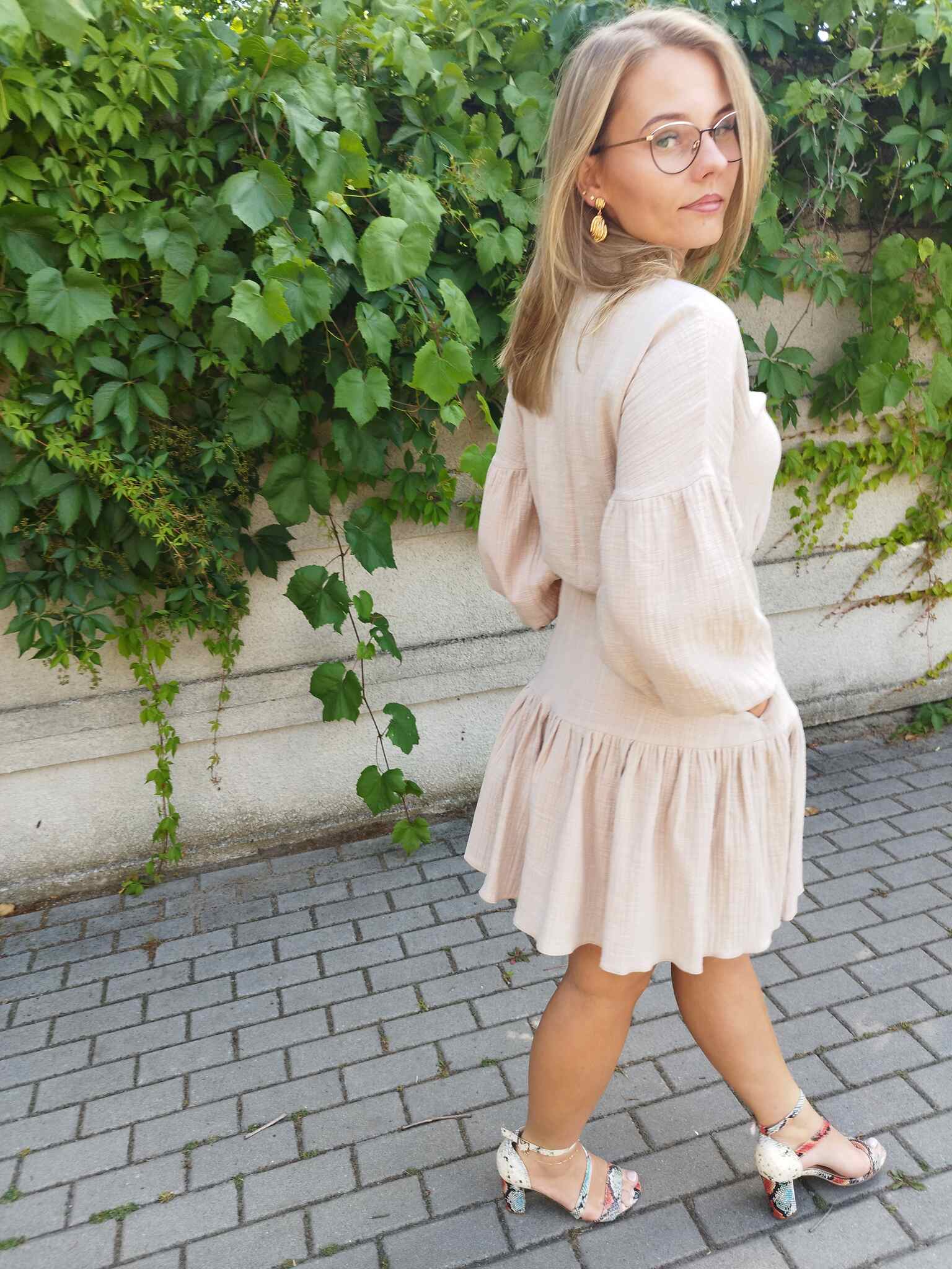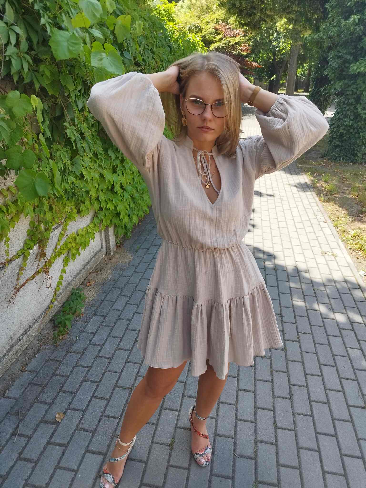 Sukienka wykonana z muślinu, najczęściej i najchętniej kupowanej tkaniny w tym sezonie. Fason wykonany w stylu boho. Szerokie rękawy zakończone gumką, spódnica z falbaną, wiązanie przy szyi. Luźna konstrukcja zapewnia swobodę ruchu, gumka w pasie dopasowuje się do sylwetki. Idealna na letnie stylizacje z uwagi na właściwości tkaniny. Delikatna, zwiewna i wysoko higroskopijna.